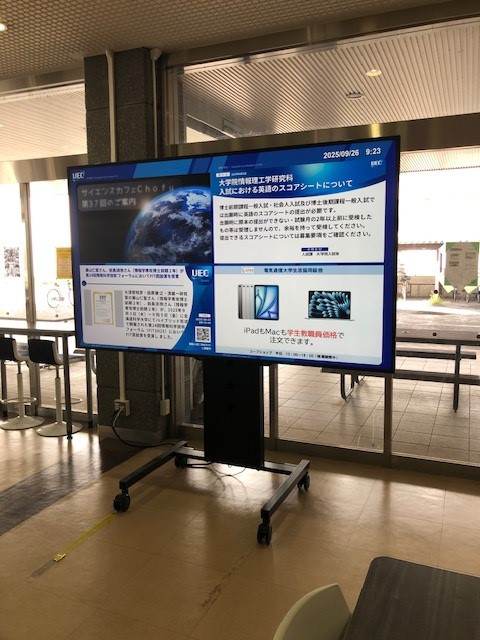「全学デジタルサイネージ」は、学内9箇所に設置し、学生や教職員、来校者に向けたお知らせを掲載しています。