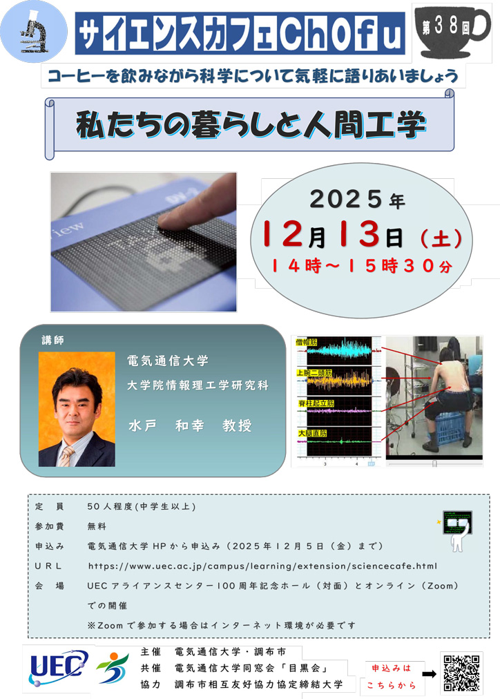 | 申込方法 | こちらの申込みフォームよりお申込みください。 サイエンスカフェChofu申込みフォーム 申込期間:2025年11月5日(水)から2025年12月5日(金)まで |