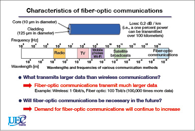 The Matsuura laboratory’s research looks at ways of advancing fiber-optic communications. This research covers three basic topics. The first research topic is ultra-fast optical signal processing technology with an aim toward attaining the maximum possible speeds and performance levels. The second topic is disaster-resilient communication technology that fuses fiber-optic communications and wireless communications, called “radio-over-fiber”. And the third is research into fiber-optic transmission technology using state-of-the-art optical fiber (see Figure 2).