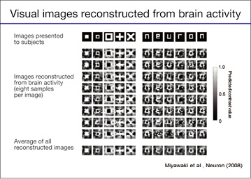 Previous research performing visual image prediction from human brain activity was based on classification, by which a brain activity pattern was classified into a limited number of stimulus classes that were predetermined by experiments. The typical procedure was as follows: they measured brain activity patterns while subjects were observing either “car” or “motorcyle” images, and trained a computational model that were able to learn difference in brain activity patterns evoked by images of each class. Then the model, or decoder, classified a new brain activity pattern into one of predetermined image classes (in this case, “car” or “motorcyle”).