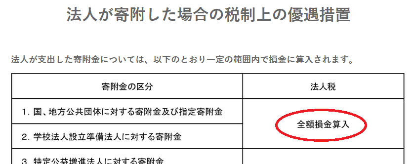 企業等の皆様からいただいたご寄附は、法人税法第37条第3項第2号により、寄附金の全額を損金算入することができます。