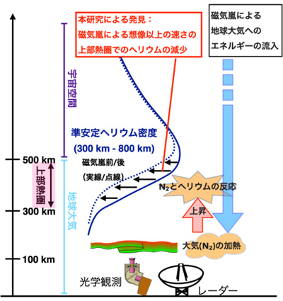 そこで、本研究は上部熱圏の観測ターゲットとして高度500kmを中心に存在する準安定ヘリウムに注目し(以下、ヘリウム)、波長1083nmのヘリウム発光に感度を持つ最新のInGaAs検出器を利用した観測機器を開発し、北極に位置するスバールバル諸島のロングイヤービン(北緯78度)での定常観測を開始しました。2023年2月26日の中規模の磁気嵐発生後に、わずか1時間以内でヘリウムの減少が確認され、また、近接する大型レーダー、European Incoherent Scatter Svalbard Radarは、磁気嵐の発達に伴い高度100km-120kmで強い大気加熱が発生したこと、および、加熱された窒素分子が少なくとも高度300kmまで上昇したことを示しました。さらに窒素分子は高度500 km付近まで上昇し、窒素分子とヘリウムとの衝突・エネルギー交換により、ヘリウムが減少する反応を促進させたと考えられます(図1)。