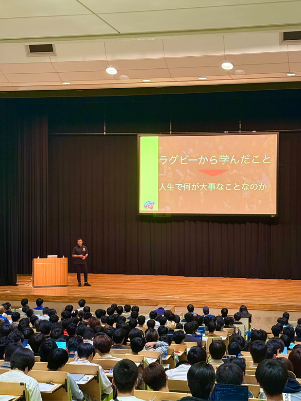 3回目を迎えた今年の講演会には、ラグビーリーグワン 東京サントリーサンゴリアス アシスタントコーチの青木佑輔氏を講師にお迎えし、「ラグビーから学んだこと」と題してご講演いただきました。青木氏は、サントリーサンゴリアス(現:東京サントリーサンゴリアス)で長年にわたりチームを牽引され、日本代表としても2011年ラグビーワールドカップ・ニュージーランド大会に出場するなど、豊富な競技経験を有しており、現役引退後は東京サントリーサンゴリアスのアシスタントコーチに就任されています。