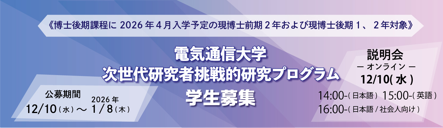 電気通信大学次世代研究者挑戦的研究プログラムの2026年度学生募集について、以下のとおり説明会および公募を実施します。