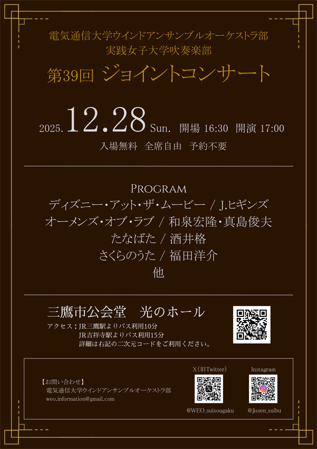 2025年12月28日(日)に三鷹市公会堂 光のホールにて、電気通信大学ウインドアンサンブルオーケストラ部・実践女子大学吹奏楽部による第39回ジョイントコンサートを行います。