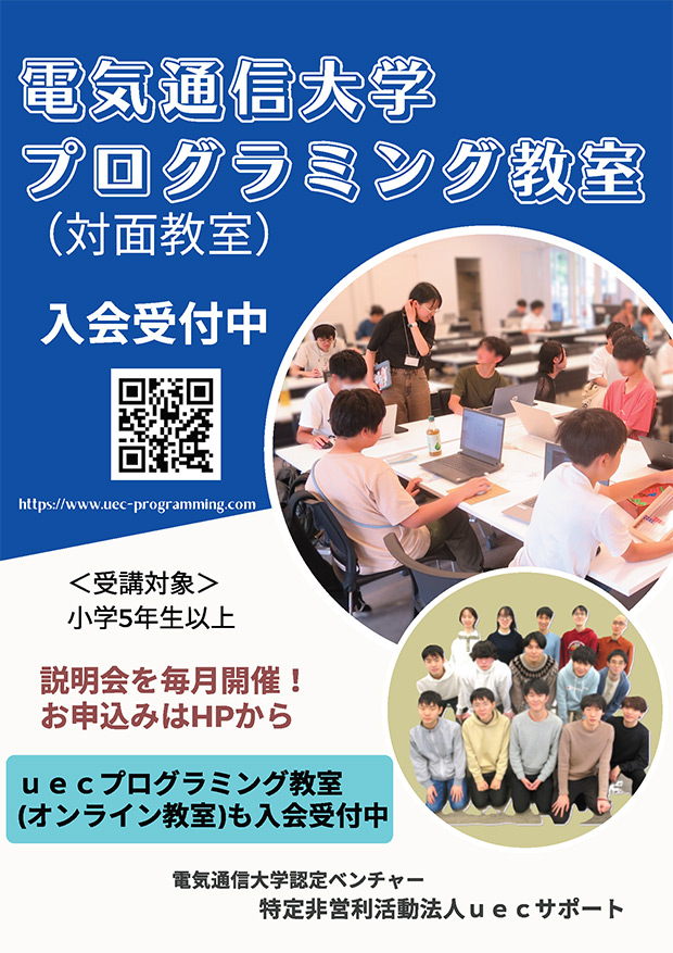 | 問い合わせ窓口 | 電気通信大学プログラミング教室/uecプログラミング教室事務局 メールアドレス:npo@uec-programming.com |