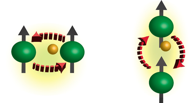 本研究では重い2粒子と軽い1粒子からなる量子3体問題を理論的に考えました。重い2粒子(Er原子やDy原子に相当)は強い磁気モーメントを持ち、その間には双極子相互作用と原子間力(van der Waals力)が働きます。重い2粒子がボース粒子である場合とフェルミ粒子である場合の両方を解析し、粒子の統計性がどのような役割を果たすのか、フェルミ3体系でどのような特異な量子挙動が現れるかを調べました。重い2粒子がフェルミ粒子である場合、フェルミ粒子の間にはパウリの排他原理が働くことで、有限の角運動量を持たなければならず、回転する量子3体系が実現します。この回転の仕方は図1のように二通りのケースがあります。一つ目は、図1の左図に示すように、原子の磁気モーメントに平行な軸を中心に回転するケース、もう一つは、右図のように、垂直な軸を中心に回転するケースです。相互作用に回転対称性がある場合、この2つの回転の仕方ではエネルギーが同じになります。それに対して、回転対称性が破れている場合、回転の仕方でエネルギーが異なり、スペクトルに分裂が生じることを発見しました。さらに、この分裂の大きさは系の詳細に依らず、少数のパラメーターで普遍的に決まることを示し、その表式を摂動計算により解析的に導出しました。一方、重い2粒子がボース粒子である場合、ボース粒子の間にはパウリの排他原理が働かないため、回転しない状態が安定に実現する基底状態になり、フェルミ粒子の時のように回転の仕方で違いが生じる余地がありません。