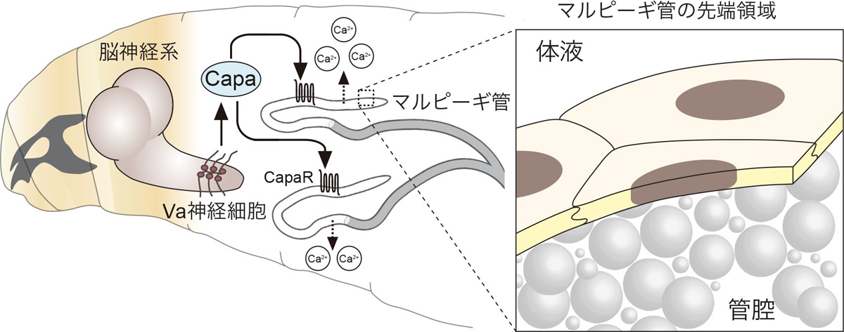 本研究では、無脊椎動物であるショウジョウバエにおいて、ペプチドホルモンCapaが体液中のカルシウム濃度を調節することを発見しました。Capaを欠損したショウジョウバエ幼虫では、体液中のカルシウム濃度が低下し、筋収縮の異常や運動能力の低下が生じました。さらに、Capaは、脳神経系の特定の神経細胞から分泌され、マルピーギ管(脊椎動物の腎臓に相当する器官)の先端領域に作用して、その領域の管腔(管状器官内側の空洞)内に蓄積する「真珠様カルシウム顆粒(PCG)」からカルシウムを放出することが分かりました。この内分泌システムは、食物からのカルシウム摂取が不足した際にカルシウムを放出することで体液中のカルシウム濃度を補う役割を担っており、脊椎動物におけるPTHの機能とよく似ています。