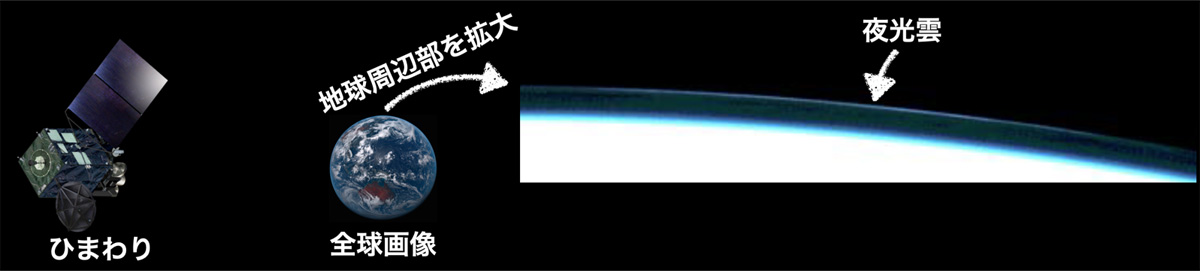2022年に発生したトンガ沖海底火山噴火は非常に大規模な火山噴火であり、1883年のクラカタウ火山噴火に匹敵する規模の火山噴火でした。本研究グループは、「火山噴火と夜光雲の関係」に着目して、最新の人工衛星による観測データの総合解析を実施しました。特に、日本の静止軌道衛星ひまわりによる夜光雲の高感度観測(図1)を有効活用することで、夜光雲の活動についての詳細な調査を行いました。