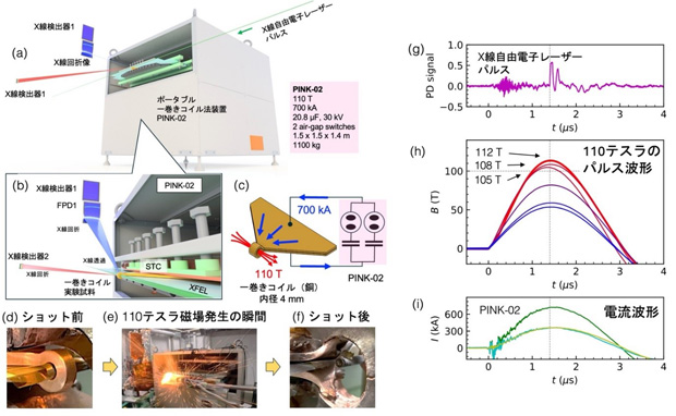研究グループはその可搬性を活かしてPINK-02をSACLAのX線照射位置に設置し、110テスラ強磁場下でのX線実験を実施しました(図1)。実験対象には固体酸素を選びました。固体酸素は磁場を有しており、磁場に応答を示します。また固体酸素は結晶格子が柔らかいという特徴を持ちます。このため、強磁場下で新しい構造が現れる有力な候補物質とされてきました。