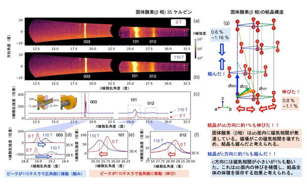 タイトル:X-ray free-electron laser observation of giant and anisotropic magnetostriction in β-O2 at 110 Tesla