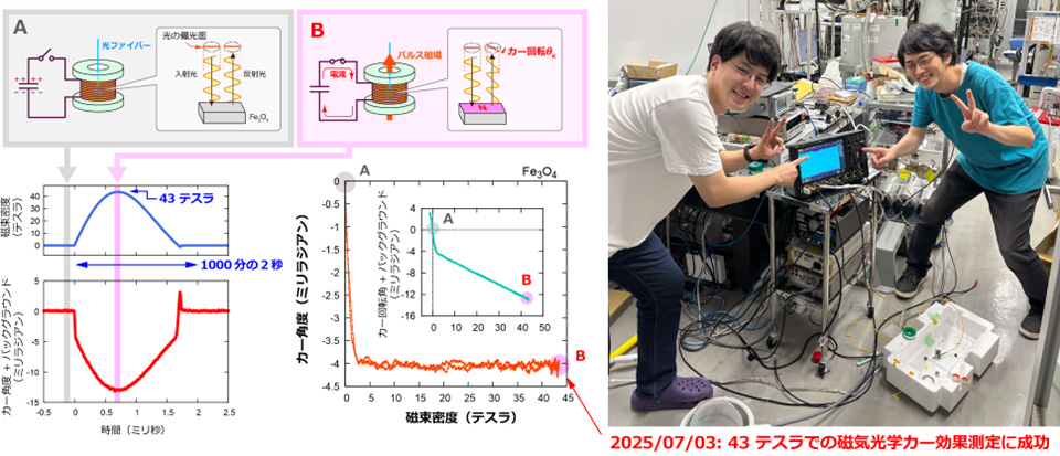 冒頭の概念図にフェリ磁性体である酸化鉄(Fe3O4)に対するパルス磁場下磁気光学カー効果測定で得られたデータを示します。左中央の青線で示された磁場波形を見ると約1.7ミリ秒の間に最大43テスラの磁場が発生していることが分かります。その下の赤線で示されたのが磁気光学シグナル(バックグラウンドを含む)であり、磁場の高速な増減に追随してシグナルも変化していることが分かります。これらのデータを、磁場を横軸としてプロットしたのが中央のグラフです。挿入図は生データの磁場依存性であり、磁気光学シグナルが急激に負の方向に立ち上がった後、緩やかに43テスラまで磁場に比例しながら変化していることが分かります。低磁場の急激な立ち上がりはフェリ磁性の磁化の飽和に起因するもので、その後の線形な変化はレンズ等の影響(磁気光学ファラデー効果)に起因するバックグラウンドであると考えられます。高磁場側の変化を差し引いたものがメインのグラフです。数テスラまででカー角度が急激に立ち上がり、その後は−4.0ミリラジアン付近で一定値をとります。Fe3O4の磁化飽和後のカー角度の文献値は室温で−4.36ミリラジアンであり、温度などの測定条件の違いも考慮すれば、今回の実験値とは十分一致しています。このことから、Fe3O4の磁気光学効果を40テスラ超のパルス強磁場中で正しく測定できたと結論付けられます。