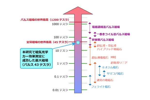 参考図表1:さまざまな手段で発生しうる磁場の大きさの比較。永久磁石や電磁石に比べ、パルス磁場を用いると桁違いに大きい磁場を発生させることができます。本研究では、パルス磁場を使うことで、定常磁場の世界最高値である45テスラに迫るような大きさの磁場において磁気光学カー効果を測定できました。