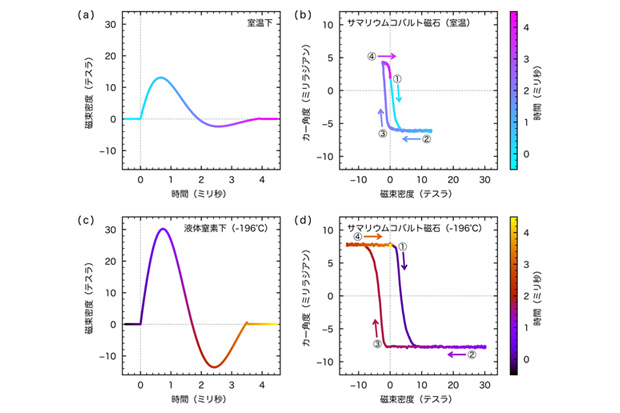 参考図表5:双極性パルス磁場を用いた磁気光学カー効果によるヒステリシス性能評価。(a)双極性パルス磁場の磁場波形。パルス磁場発生装置にダイオードを追加することで、正の磁場に引き続いて負の磁場を印加する双極性パルス磁場を生成することができます。(b)双極性パルス磁場下において測定した、サマリウムコバルト磁石の室温における磁気光学カー効果の磁場依存性(バックグラウンドは差し引き済み)。カー角度に明瞭なヒステリシスが観測されました。なお、(b)のヒステリシスが非対称に見えるのは、室温の測定ではマイナス側の磁場の大きさが不十分だったためです。実際、ごく最近測定した液体窒素下(−196℃)での測定データ(c)(d)ではマイナス側にも十分大きい磁場をかけることができたため対称的なヒステリシスが観測できています。