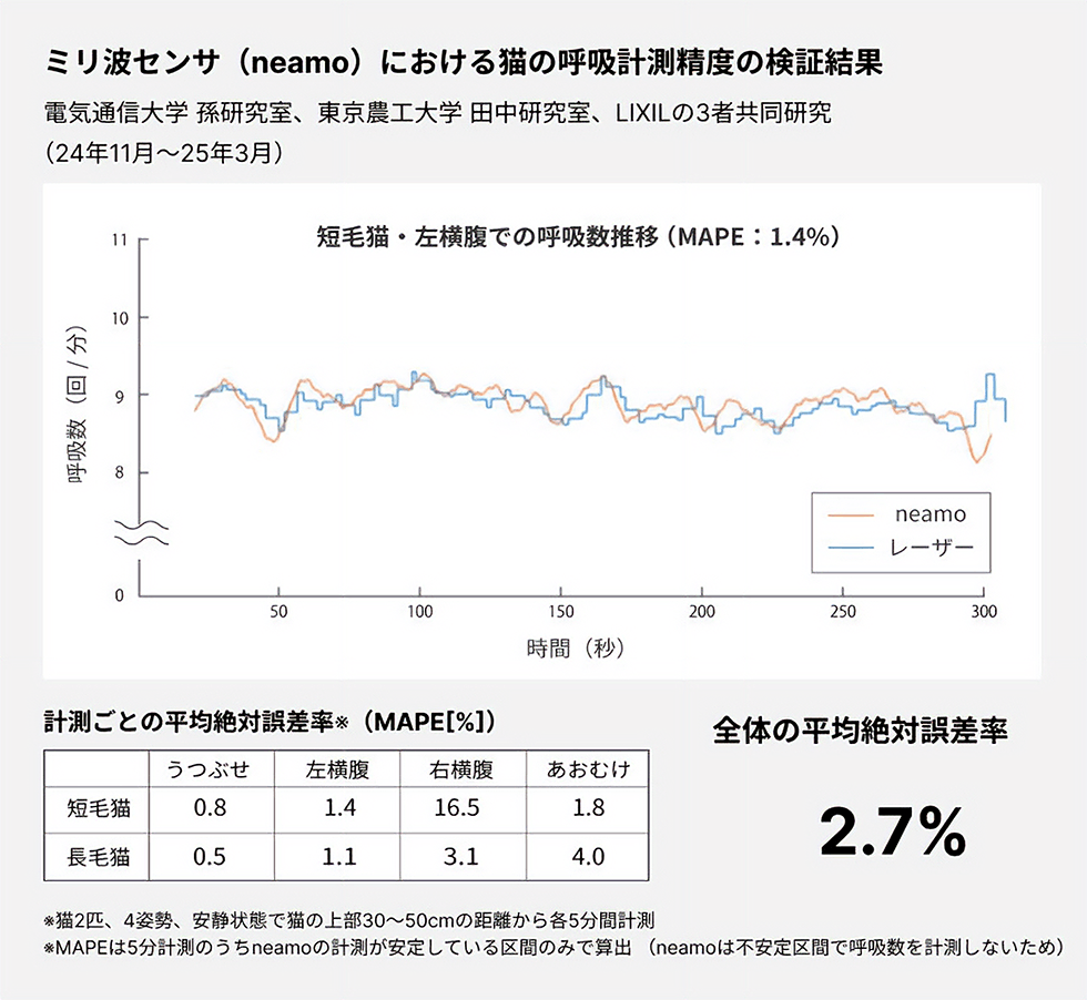 2024年11月から2025年3月にかけて、本学、東京農工大、LIXILの三者で共同研究を実施し、ミリ波センサーを用いた猫の呼吸計測精度の検証を行いました。