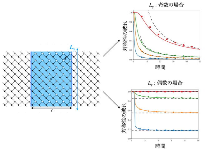 非平衡状態から平衡状態へと行き着く過程において、部分系の対称性が回復することに着目し、部分系における対称性の破れを定量化する指標として「エンタングルメントアシンメトリー(Entanglement Asymmetry)」を用い、その時間発展を解析しました。