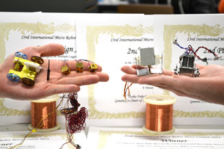 最小10mm立法のロボットや1.5inch(38.1mm)の多脚、二脚ロボットを用い走行タイムを競う部門や、特殊なマイクロロボットを作成してパフォーマンスを行う部門などがあり、今大会では多くの部門で多数の賞を受賞しました。