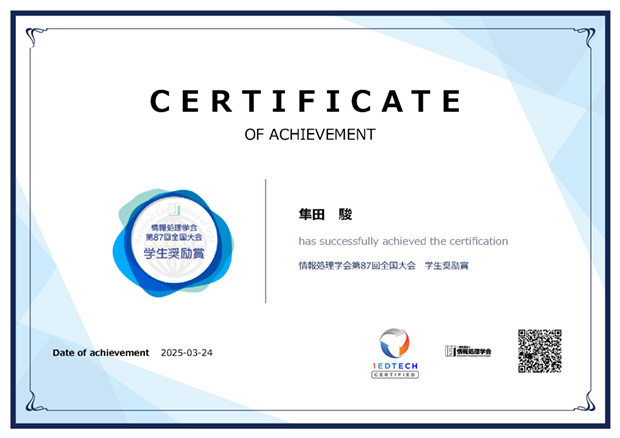 伊藤大雄・三重野琢也研究室の隼田駿さん(情報・ネットワーク工学専攻博士前期2年)が、2025年3月13日(木)~15日(土)に立命館大学大阪いばらきキャンパスで開催された情報処理学会 第87回全国大会において、学生奨励賞を受賞しました。