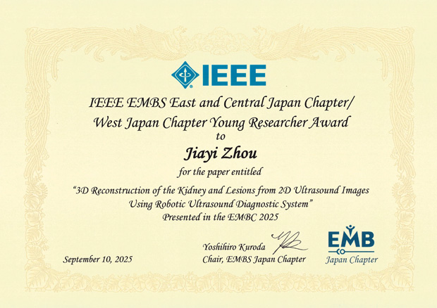 小泉憲裕研究室のZhou Jiayiさん(機械知能システム学専攻博士後期3年)が、2025年7月14日(月)~17日(木)にコペンハーゲン・デンマークで開催された47th Annual International Conference of the IEEE Engineering on Medicine and Biology Society(EMBC 2025)において、IEEE EMBS East and Central Japan Chapter/West Japan Chapter Young Researcher Awardを受賞しました。