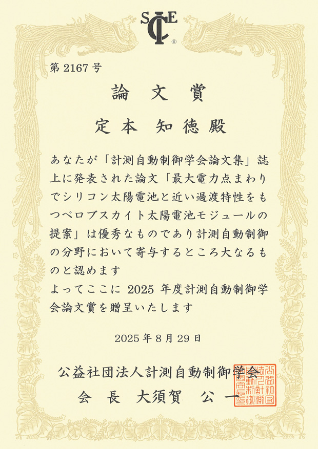 本賞は同学会が発行する論文誌、計測自動制御学会論文集に掲載された論文の中から優れた論文に対して与えられる賞です。
