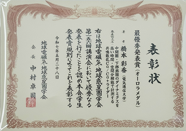 桂川眞幸研究室・大饗千彰研究室の橋本彩香さん(基盤理工学専攻博士後期2年)が、2024年11月23日(土)~27日(水)に立川市で開催された地球電磁気・地球惑星圏学会(SGEPSS)第156回 総会・講演会(2024年秋学会)において行ったポスター発表により、最優秀発表賞(オーロラメダル)を受賞し、2025年5月28日(水)のSGEPSS総会にて、授賞式が行われました。