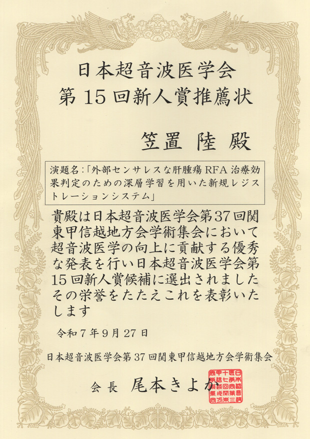 【発表題目】外部センサレスな肝腫瘍RFA治療効果判定のための深層学習を用いた新規レジストレーションシステム(日本超音波医学会第37回関東甲信越地方会学術集会予稿集,pp.115)