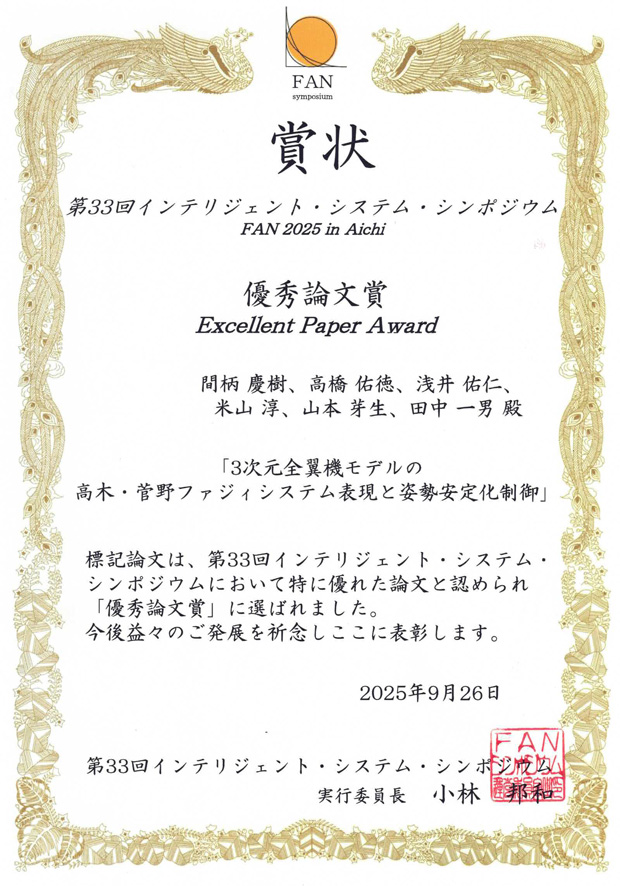 田中一男教授(機械知能システム学専攻)と山本芽生さん(機械知能システム学専攻博士後期1年)らが、 2025年9月25日(木)、26日(金)に愛知県立大学長久手キャンパスにて開催された電気学会電子・情報・システム部門(C部門)主催の第33回インテリジェント・システム・シンポジウム-FAN 2025 in Aichi(The 33rd Symposium on Fuzzy, Artificial Intelligence, Neural Networks and Computational Intelligence)において、優秀論文賞を受賞しました。