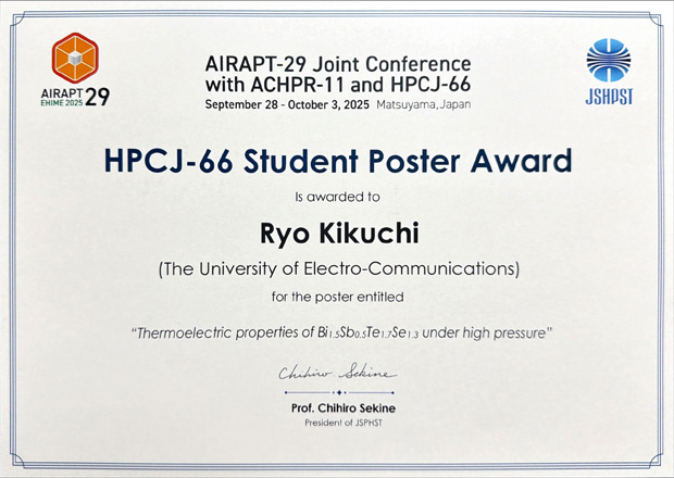 松林和幸研究室の菊池良さん(基盤理工学専攻博士前期1年)が、2025年9月28日(日)〜10月3日(金)に愛媛県県民文化会館で開催された国際会議 29th International Conference on High Pressure Science and Technology(IRAPT-29)において、Student Poster Award を受賞しました。