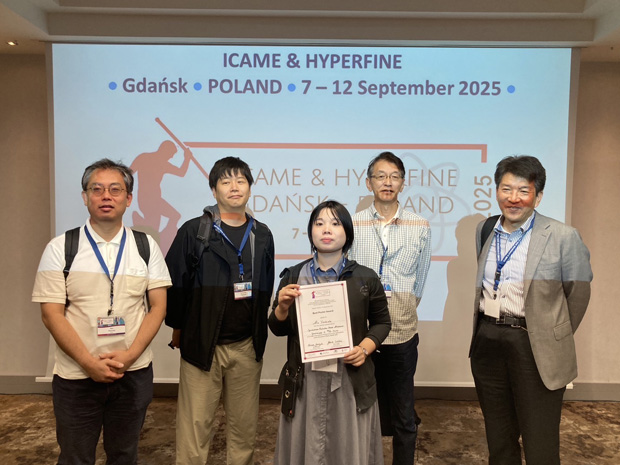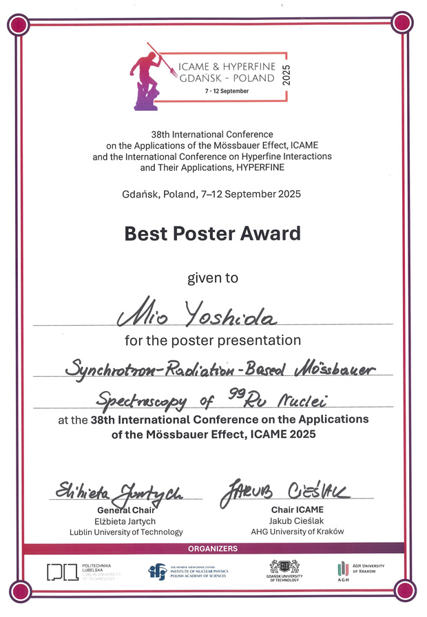 中村仁研究室の吉田実生さん(基盤理工学専攻博士後期3年)が、2025年9月7日(日)から9月12日(金)までポーランド・グダニスク(Gdańsk, Poland)で開催されたメスバウアー分光の応用に関する国際会議38th International Conference on the Applications of the Mössbauer Effect(ICAME2025)においてポスター発表し、Best Poster Awardを受賞しました。