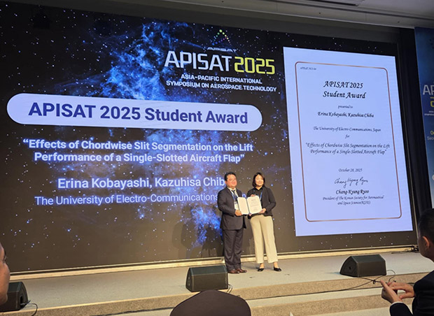 千葉一永研究室の小林英里奈さん(機械知能システム学専攻博士後期2年)が2025年10月27日(月)〜29日(水)に韓国ソウルで開催されたThe 16th Asia-Pacific International Symposium on Aerospace Technology (APISAT 2025)でStudent Awardを受賞しました。