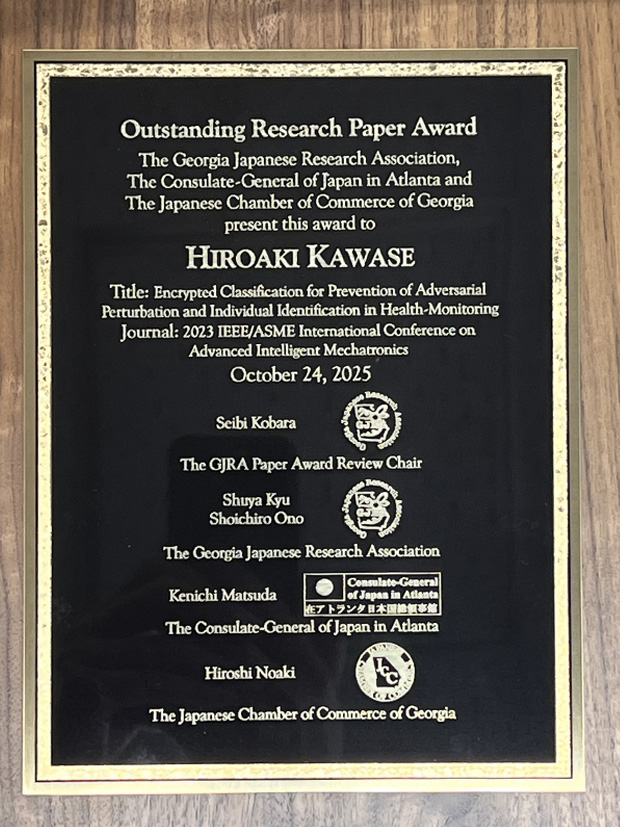 小木曽公尚研究室の川瀬廣明さん(機械知能システム学専攻博士後期3年)が、2023年6月27日(火)から7月1日(土)にシアトルで開催された2023 IEEE/ASME International Conference on Advanced Intelligent Mechatronics(AIM)で発表した国際会議論文が、2025年10月24日(金)に開催された第49回ジョージア日本人研究者の会において、ジョージア論文賞を受賞しました。