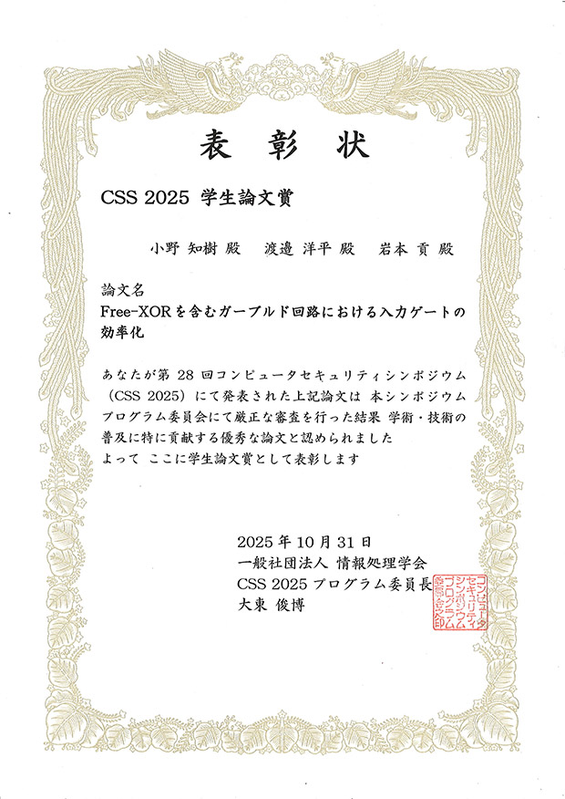岩本貢・渡邉洋平研究室の小野知樹さん(情報学専攻博士後期2年)と渡邉洋平准教授(情報学専攻)、岩本貢教授(情報学専攻)の共著論文が、2025年10月27日(月)~31日(金)に、岡山県岡山コンベンションセンターとオンラインのハイブリッド形式で開催されたコンピュータセキュリティシンポジウム2025(CSS2025)において、CSS2025学生論文賞を受賞しました。