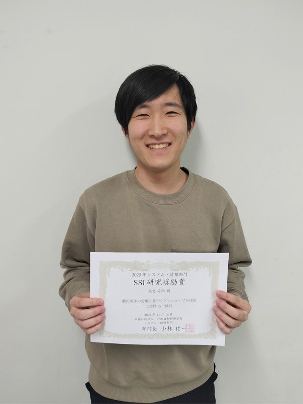 佐藤寛之研究室の高宮諒翔さん(情報学専攻博士前期2年)が、2025年11月12日(水)~14日(金)に、東北大学青葉山キャンパスで開催された計測自動制御学会システム・情報部門学術講演会(SSI2025)において、SSI研究奨励賞を受賞しました。