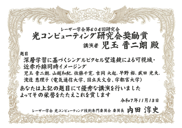渡邉恵理子研究室の児玉晋二朗さん(基盤理工学専攻博士後期1年)が、2025年11月12日(水)、13日(木)に金沢歌劇座にて対面とオンラインのハイブリッド形式で開催されたレーザー学会第604回研究会「光コンピューティング研究会」において口頭発表を行い、奨励賞を受賞しました。