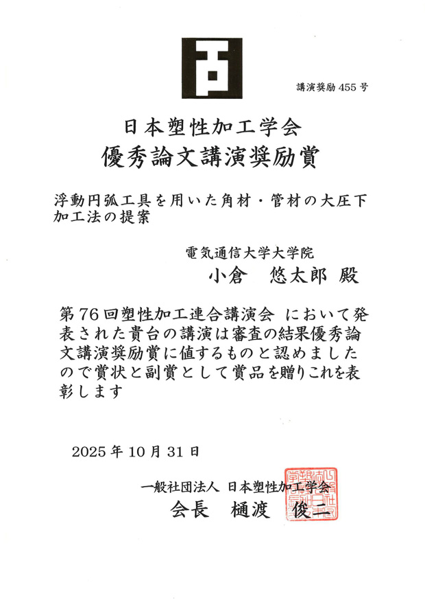 久保木孝研究室の井内皓仁さん(機械知能システム学専攻博士前期1年)と小倉悠太郎さん(機械知能システム学専攻博士前期1年)が、2025年9月24日(水)、25日(木)に茨城大学水戸キャンパスで開催された日本塑性加工学会 第76回塑性加工連合講演会において、優秀論文講演奨励賞を受賞しました。