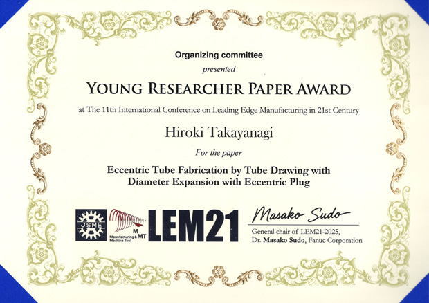 梶川翔平研究室の高柳大樹さん(機械知能システム学専攻博士前期2年)が、2025年12月1日(月)~4日(木)にシャボン玉石けんくくる糸満(沖縄県糸満市)にて開催された国際学会LEM21(The11th International Conference on Leading Edge Manufacturing in 21st Century)において、Young Researcher Paper Awardを受賞しました。