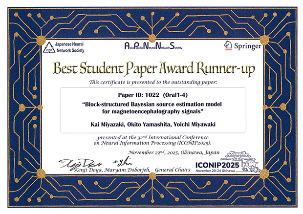 宮脇陽一研究室の宮﨑海さん(機械知能システム学専攻博士後期3年)が、2025年11月20日(木)~24日(月)に沖縄科学技術大学院大学(OIST)で開催されたAsia Pacific Neural Network Society(APNNS)主催の年次国際会議「International Conference on Neural Information Processing (ICONIP) 2025」で口頭発表を行い、Best Student Paper Runner-up Awardを受賞しました。