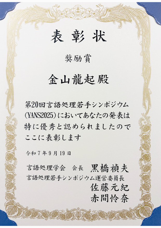 柳井啓司研究室の金山龍起さん(情報学専攻博士前期1年)ら情報学専攻デザイン思考・データサイエンス(D×2)プログラムのメンバーが中心となって構成されたチームの研究発表が、2025年9月17日(水)から19日(金)にアクトシティ浜松で開催された第20回言語処理若手シンポジウム(YANS2025)において、奨励賞を受賞しました。