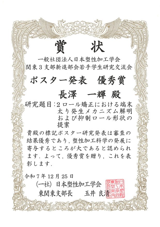 久保木孝研究室の長澤一輝さん(機械知能システム学専攻博士前期2年)が、2025年12月25日(木)に茨城県水戸市民会館で開催された日本塑性加工学会 関東地域3支部新進部会合同「若手学生研究交流会」のポスターセッションにおいて優秀ポスター発表賞を受賞しました。
