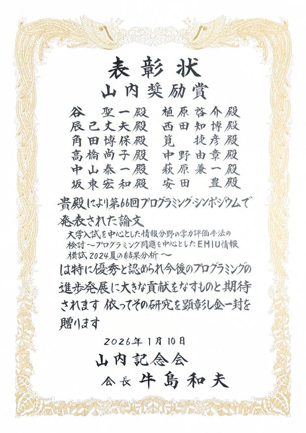 角田客員教授と中山教授らは、第66回プログラミング・シンポジウムにおいて「大学入試を中心とした情報分野の学力評価手法の検討~プログラミング問題を中心としたEMIU情報模試2024夏の結果分析~」の研究発表を行い、山内記念会の選考により本賞の受賞が決まりました。