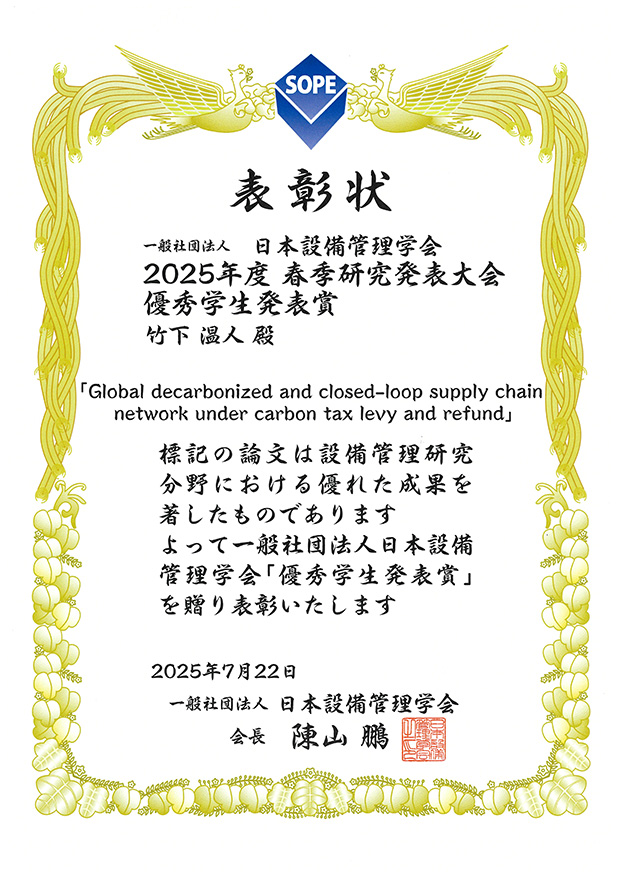 山田哲男研究室の竹下温人さん(情報学専攻博士前期2年)が、2025年7月22日(火)にオンラインで開催された一般社団法人日本設備管理学会2025年度春季研究発表大会において、優秀学生発表賞を受賞しました。