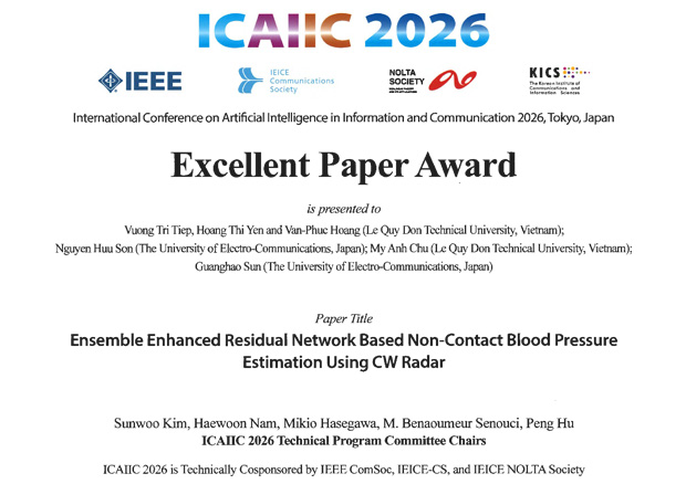 孫光鎬研究室のNGUYEN HUU SONさん(機械知能システム学専攻博士後期3年)とHOANG THI YENさん(機械知能システム学専攻博士後期課程2023年9月修了)が、2026年2月24日(火)~26日(木)に東京理科大学神楽坂キャンパスで開催されたThe 8th International Conference on Artificial Intelligence in Information and Communicationにおいて、Excellet Paper Awardを受賞しました。