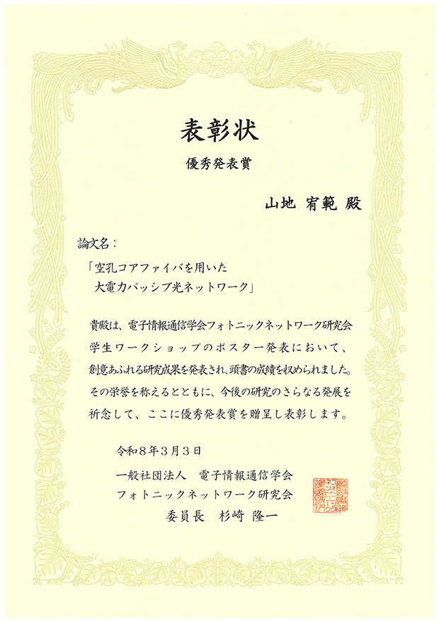 松浦基晴研究室の山地宥範さん(情報・ネットワーク工学専攻博士前期2年)が、2026年3月3日(火)に沖縄県那覇市で行われた電子情報通信学会フォトニックネットワーク研究会主催の学生ワークショップにおいて、「空孔コアファイバを用いた大電力パッシブ光ネットワーク」と題した論文を発表し、今年度の優秀発表賞を受賞しました。