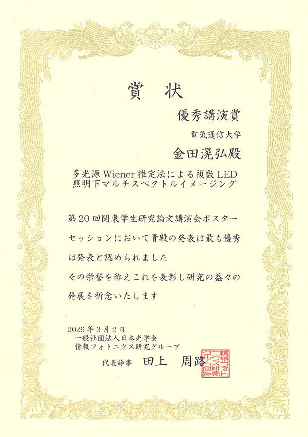 渡邉恵理子研究室の金田滉弘さん(Ⅲ類(理工系)光工学プログラム4年)が、2026年3月2日(月)に東邦大学習志野キャンパスにて対面で開催された第20回 関東学生研究論文講演会においてポスター発表を行い、優秀講演賞を受賞しました。