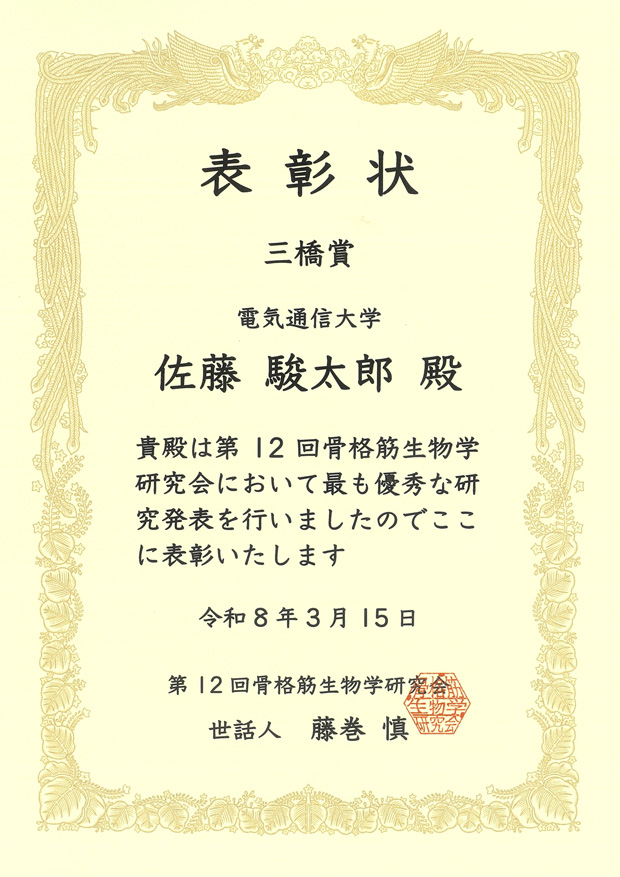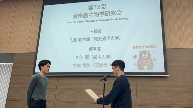 星野太佑研究室の佐藤駿太郎さん(基盤理工学専攻博士前期1年)が、2026年3月13日(金)~15日(日)に熊本大学病院くすのきテラスにて開催された第12回骨格筋生物学研究会において、三橋賞(最優秀発表賞)を受賞しました。
