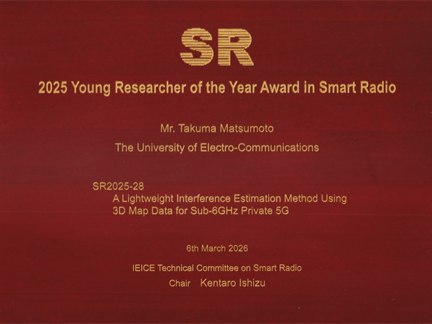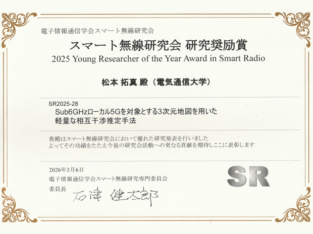 藤井威生研究室(先端ワイヤレス・コミュニケーション研究センター)の松本拓真さん(Ⅱ類(融合系)情報通信工学プログラム4年)が、2026年3月6日(金)に2025年電子情報通信学会スマート無線研究会研究奨励賞を受賞しました。