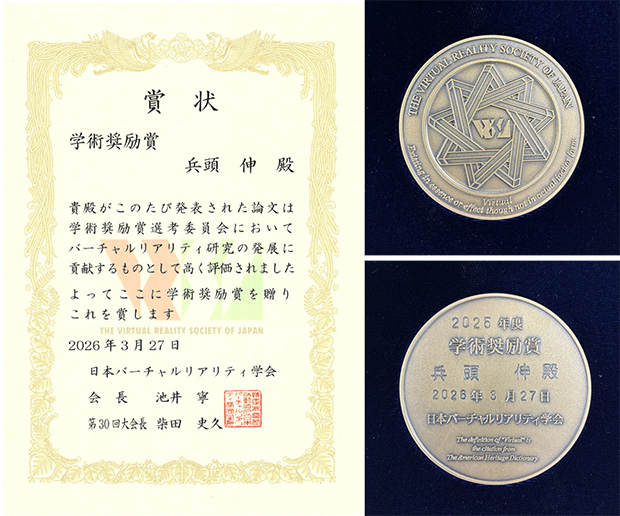 梶本裕之研究室の兵頭伸さん(Ⅰ類(情報系)メディア情報学プログラム4年)が、2025年9月17日(水)〜19日(金)にに立命館大学大阪いばらきキャンパスで開催された第30回日本バーチャルリアリティ学会大会において、学術奨励賞を受賞し、2026年3月27日(金)に東京大学工学部2号館で開催された同学会総会にて、表彰されました。