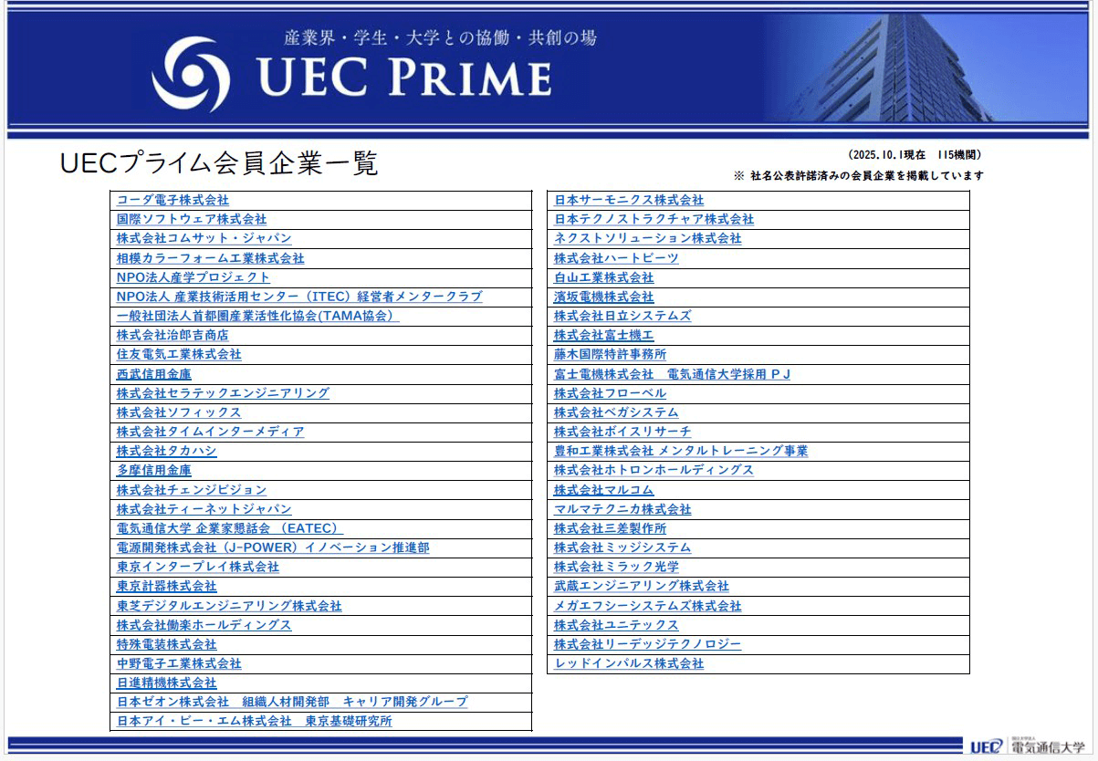 本学は、大学の知の社会実装と高度人材の輩出を推進する産学連携の好循環を実現することを目的として、産学連携会員組織「UECプライム」を設立することといたしました。