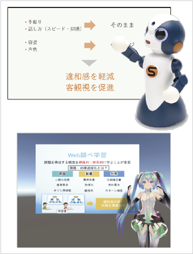 このほか、ロボットやアバター(分身)を活用した効果的なプレゼンテーションの支援方法も提案しています。人気キャラクターのアバターや、市販の対話ロボットなどを使い、これらに人の実際のプレゼン動作を投影し、顔や腕の動き、音声などを忠実に再現させることによって、自分の動作を客観的に評価できるようにしました。