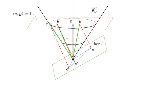 最近は、従来の効率的な解法を適用しにくい錐線形最適化問題において、「内点許容解」が存在する等価な錐線形最適化に変形する「Facial Reductionアルゴリズム(FRA)」と呼ばれる手法を使ったアイデアを研究しています。そのほか、これを拡張し、同次対称錐最適化問題の内点実行可能解を求める新しいアルゴリズムなども開発しています。